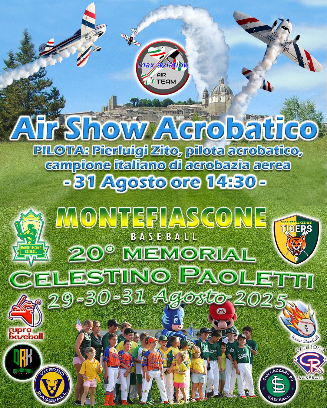 Protagonista dello spettacolo sarà il pilota acrobatico Pierluigi Zito, istruttore di volo presso la Scuola di volo Max Aviation, di Massimo Testa, già dirigente del Montefiascone Baseball, che ha svolto tutte le procedure per offrire ai 100 ragazzi partecipanti al torneo uno spettacolo inaspettato, che certamente li emozionerà.