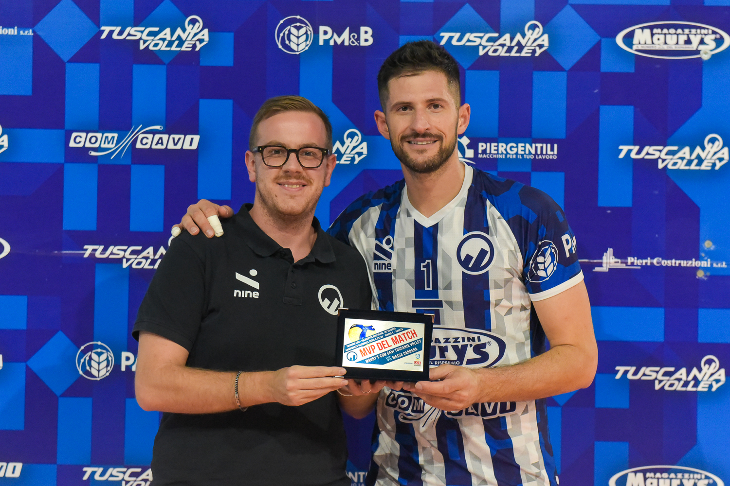 Mvp: Capitan Pierlorenzo Buzzelli premiato da Marco Fapperdue, presidente Avis Tuscania e speaker ufficiale Tuscania Volley