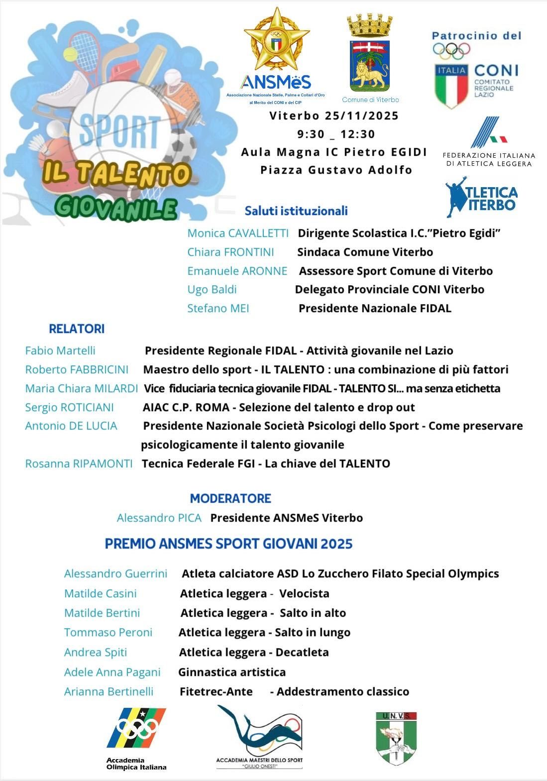 L’Associazione Nazionale Stelle, Palme e Collari D’Oro al merito sportivo del CONI e del CIP Comitato Provinciale di Viterbo, in collaborazione con l’Atletica Viterbo hanno programmato per martedi 25 novembre prossimo presso l’Aula Magna dell’I.C. Pietro Egidi il convegno “SPORT: il talento giovanile”.