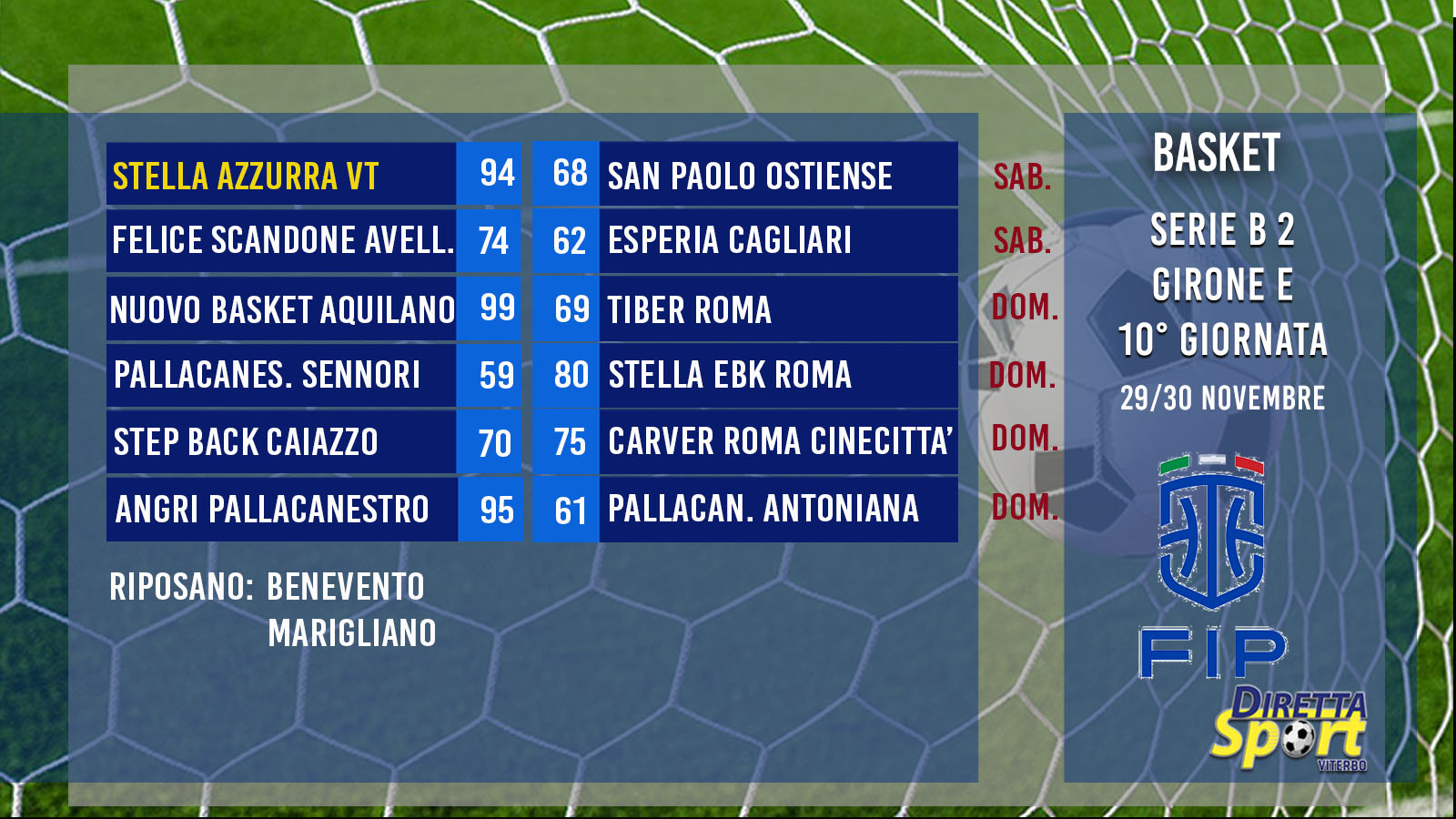 BASKET B2 GIR.E – Risultati della 10° Giornata e Classifica.