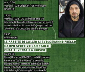 / 2 mesi agoOggi pomeriggio al San Paolo di Cura di Vetralla, il primo Memorial Umberto Baggiani. L’evento è dedicato al ricordo dell’ex calciatore delle giovanili di Viterbese e Vetralla, prematuramente scomparso circa due anni fa all’età di 45 anni.